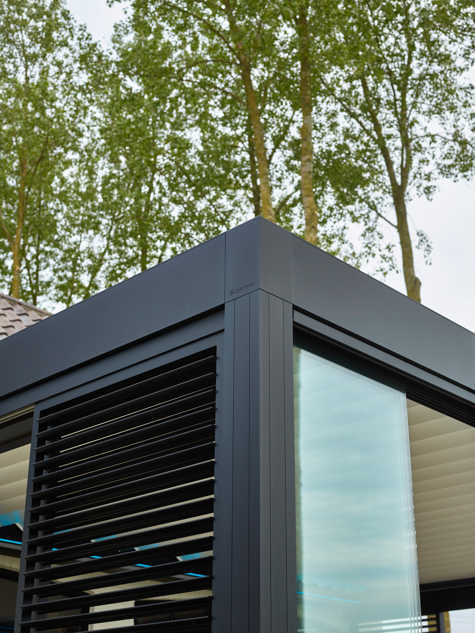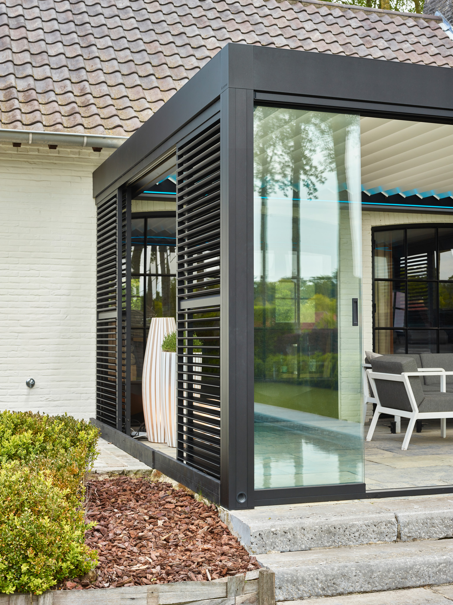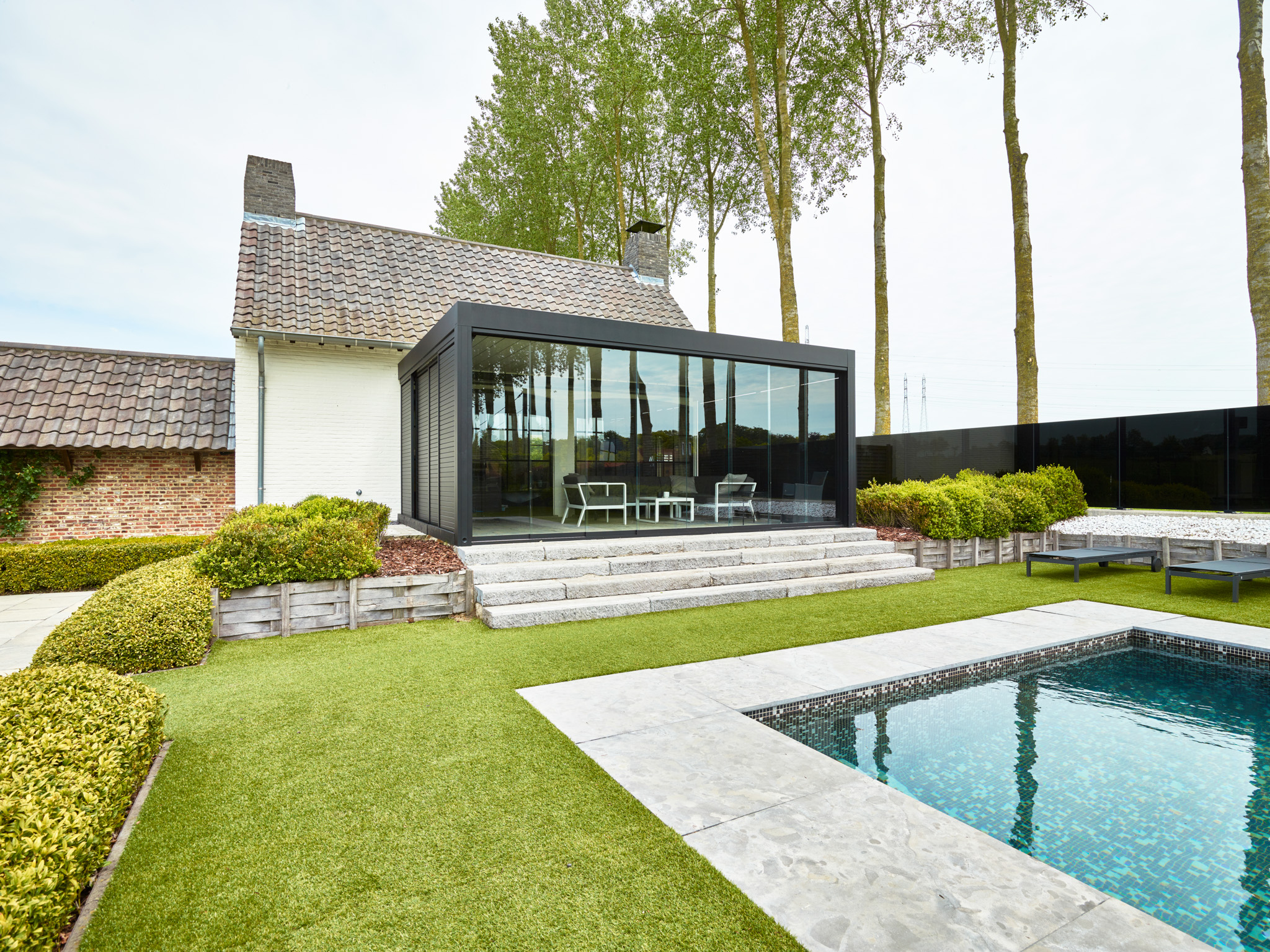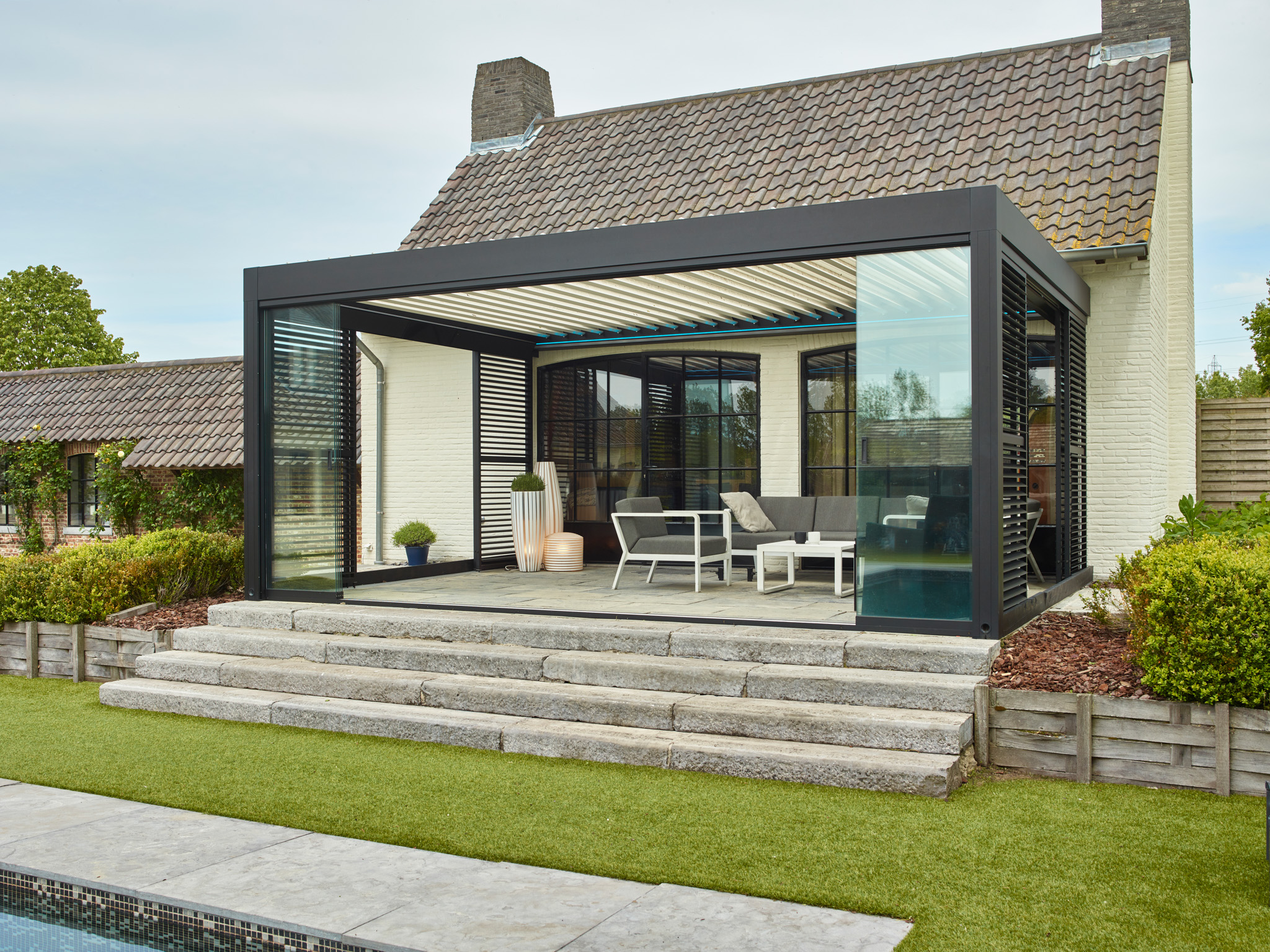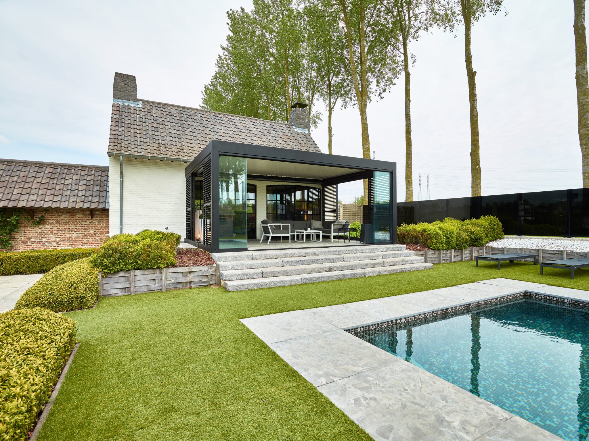 Renson Camargue terrasoverkapping aan een landelijke hoeve te Wortegem.